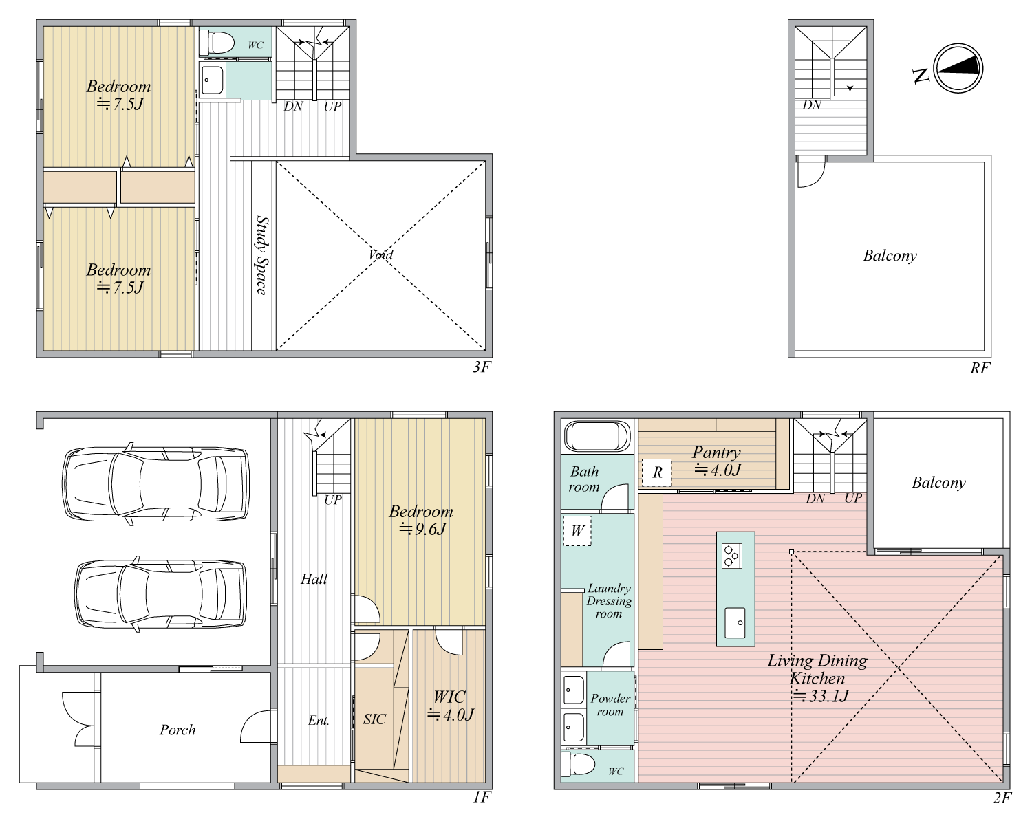 敷地を活かした3階建て3LDK+2台分ガレージ+ルーフバルコニーのプランなどいかがでしょうか。