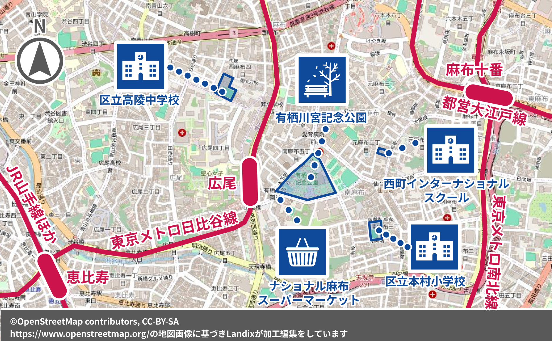 東京メトロ日比谷線 広尾駅 徒歩10分 東京メトロ南北線 麻布十番駅 徒歩12分 都営大江戸線 麻布十番駅 徒歩12分 東京メトロ日比谷線 六本木駅 徒歩20分 都営大江戸線 六本木駅 徒歩20分 |