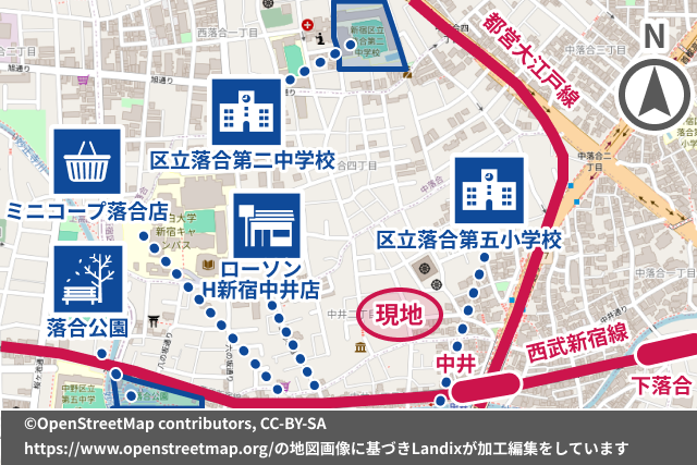 都営大江戸線 中井駅 徒歩4分 西武新宿線 中井駅 徒歩5分 東京メトロ東西線 落合駅 徒歩9分 |