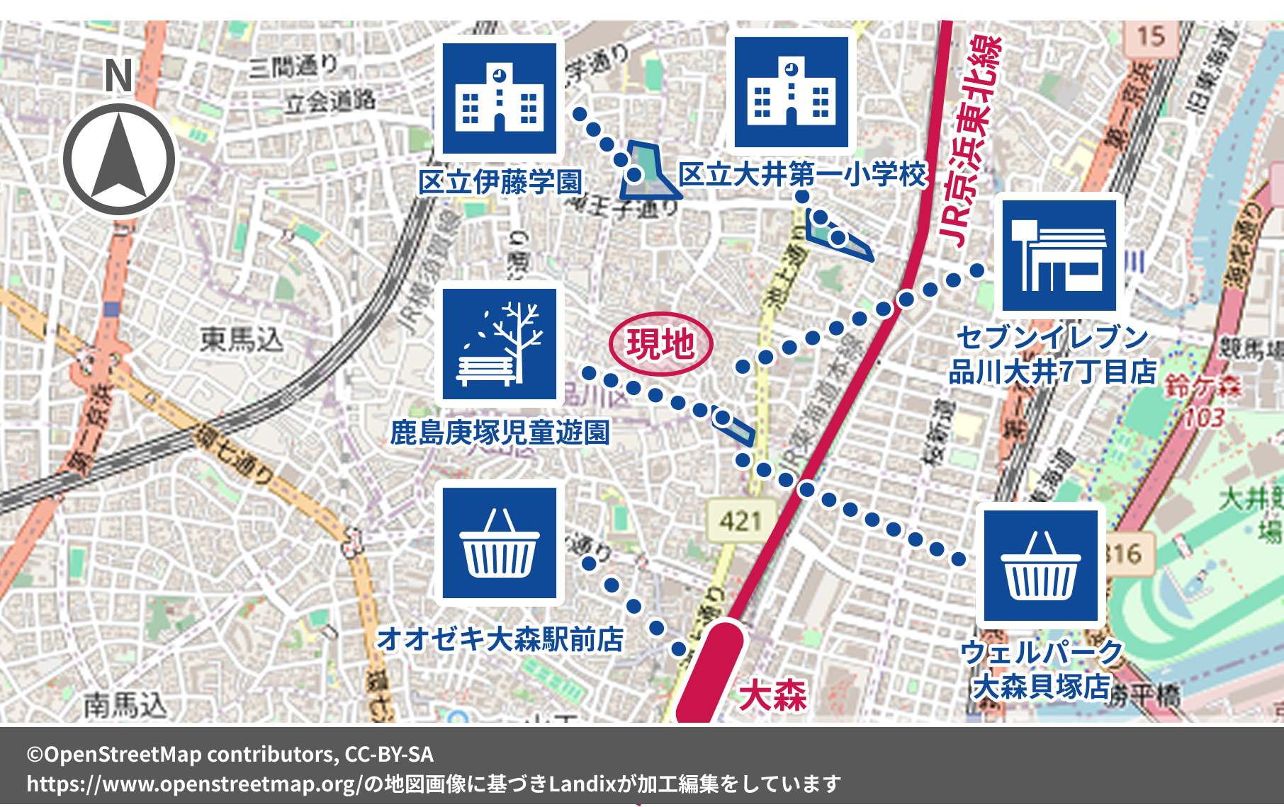 交通利便性も抜群で、都心だけでなく神奈川方面へのアクセスも良好。駅から少し離れると閑静な住宅街が広がり、落ち着いた住環境が整っています。多世代にわたって住みやすいエリアとして、安定した人気を誇ります。また、明治時代にアメリカの動物学者モース博士が「大森貝塚」を発見したことで、この地は日本考古学発祥の地としても知られています。現在、大森貝塚は「大森貝塚遺跡庭園」として整備されており、散策しながら縄文時代の歴史を学べる貴重な場所となっています。