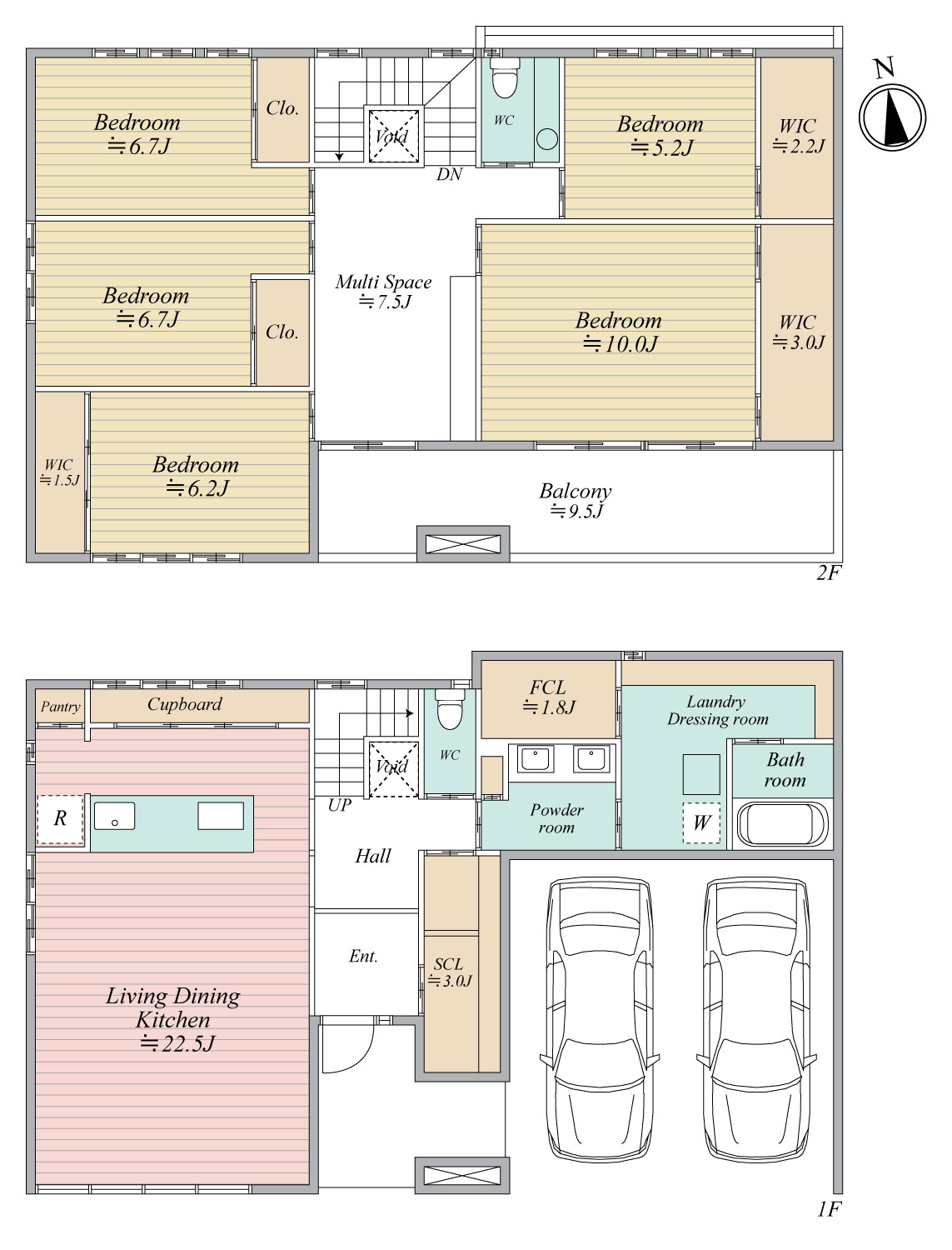 本物件は、間口約15mの整形地。ゆとりある区画を活かし、2階建て5LDK+並列2台駐車のプランなど、自由な設計が可能です。1階には約22.5帖のLDKを確保。対面式キッチンや造作家具などを取り入れ、上質な空間を演出できます。2階にはすべて5帖以上の居室を設け、主寝室にはウォークインクローゼットを設置。家族構成や将来のライフスタイルの変化にも対応できる間取りが実現可能です。