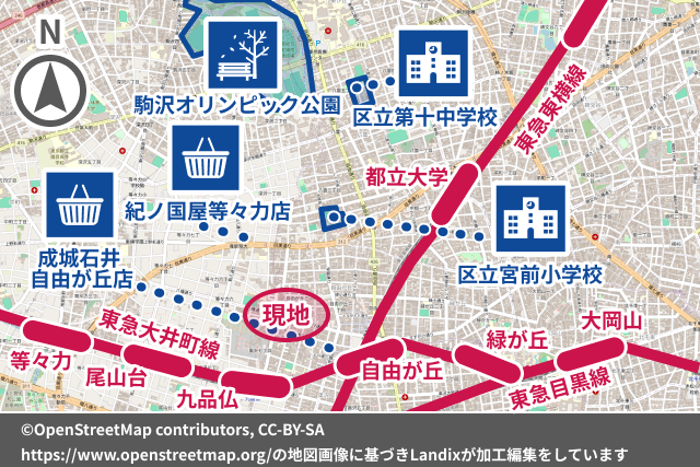 | 最寄駅 | 自由が丘 徒歩 10分 自由が丘 徒歩 10分 都立大学 徒歩 12分 緑が丘 徒歩 15分 奥沢 徒歩 15分 |