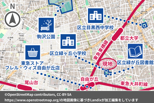 東急東横線 自由が丘駅 徒歩10分 東急大井町線 自由が丘駅 徒歩10分 東急東横線 都立大学駅 徒歩12分 東急大井町線 緑が丘駅 徒歩15分 東急目黒線 奥沢駅 徒歩15分 |