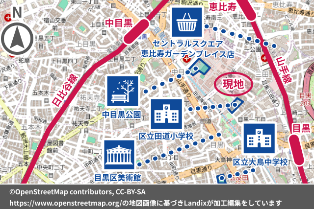 恵比寿と目黒、そして中目黒という都心の主要駅の中間に位置するロケーションは、利便性と住環境がハイレベルで共存する人気エリアです。