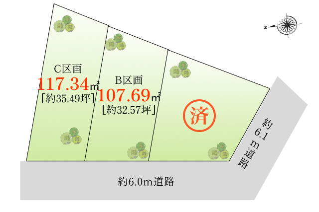 B区画: 107.69㎡ (32.57坪)、C区画: 117.34㎡ (35.49坪) |