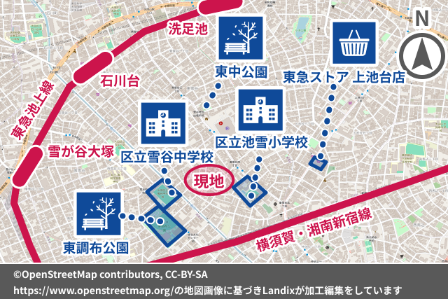 「東雪谷」は大田区の北部、東急池上線「石川台」駅の南東に広がる地域。都心部への中継駅・五反田駅まで直通14分、渋谷へ21分、新宿へ28分でアクセスできる交通利便性の高さと、呑川による谷筋から広がる落ち着いた街並みを擁するハイレベルな住環境は多くの世代に支持されています。