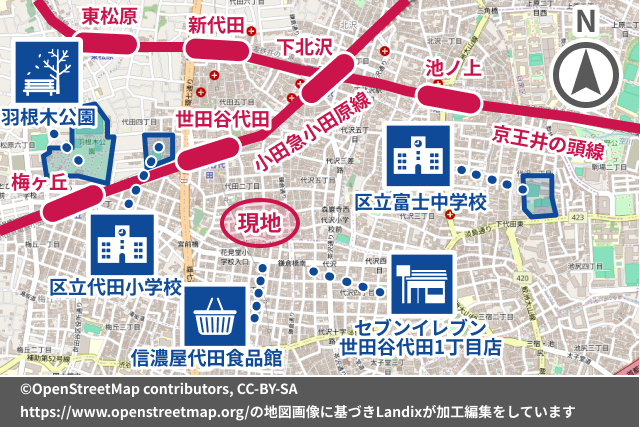 小田急線 世田谷代田駅 徒歩7分 小田急線 下北沢駅 徒歩13分 京王井の頭線 下北沢駅 徒歩13分 |