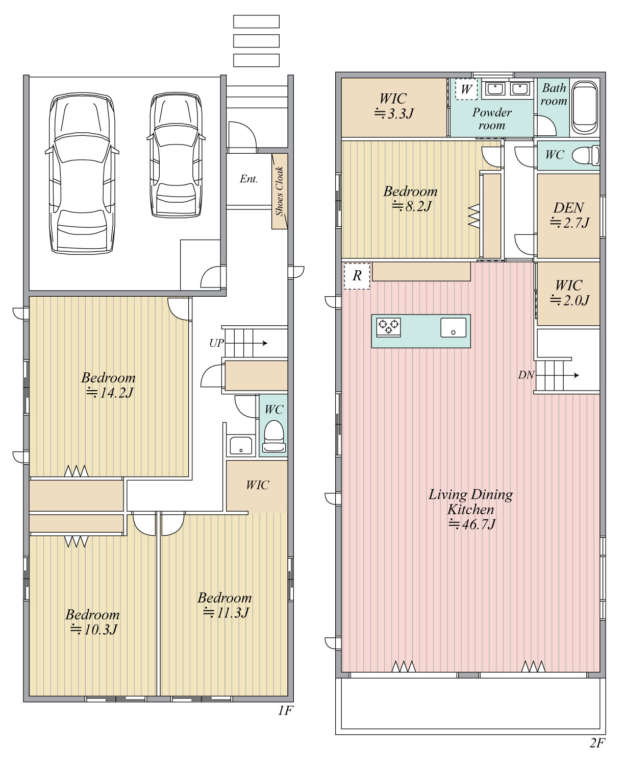そんな深沢の第一種低層住居専用地域にある本物件。ゆとりある敷地を活かした2階建て4LDK+2台駐車可の参考プランをご用意。「開放感を追求した間取り」をコンセプトに、2階に設置する約40帖のLDKが大きなポイントです。光と風を取り込む広々とした空間は、家族の団らんやホームパーティ、読書や趣味など、ご家族のさまざまなシーンで活躍してくれるはず。同じ階にWICがあり、季節ものの収納にぴったり。