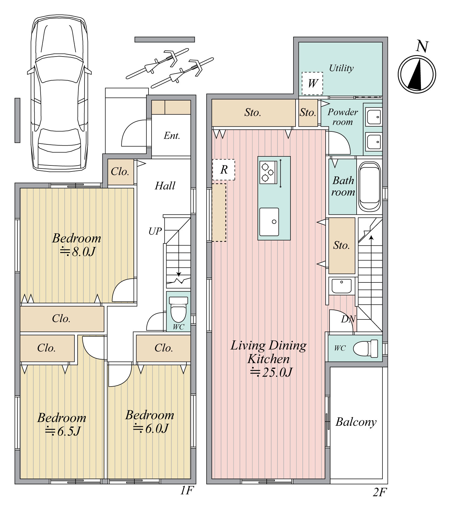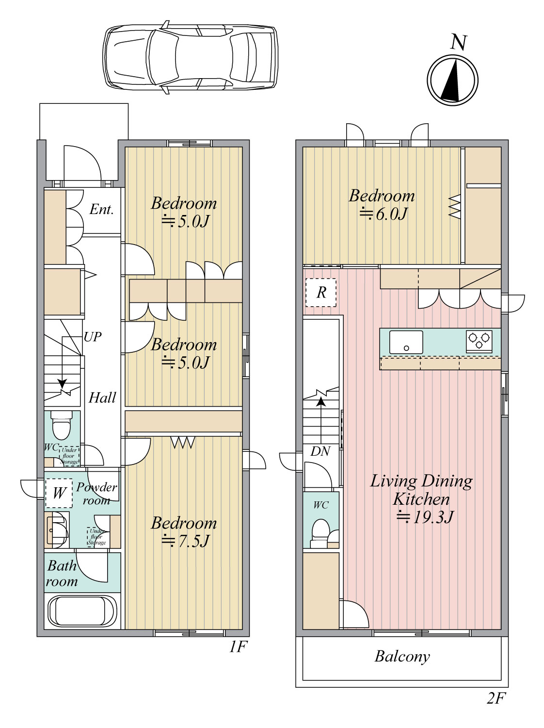北側接道のためボリュームが取りやすく、カースペース付き2階建て3~4LDKのプランが可能です。