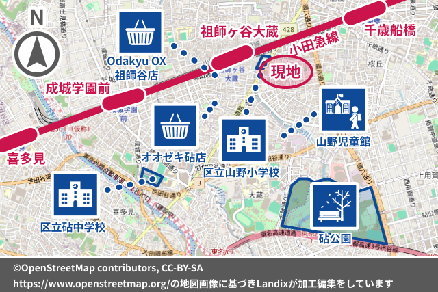 小田急線 祖師ヶ谷大蔵駅 徒歩7分 小田急線 千歳船橋駅 徒歩15分 小田急線 成城学園前駅 徒歩18分 |