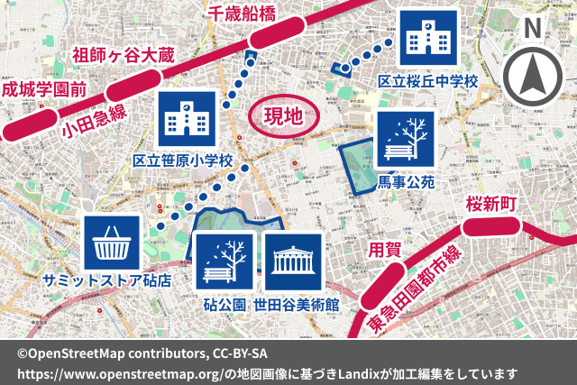 小田急線 千歳船橋駅 徒歩15分 小田急線 祖師ヶ谷大蔵駅 徒歩23分 |