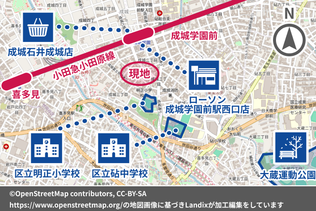 ●成城2丁目アドレス、徒歩5分の駅まで平坦な道のり