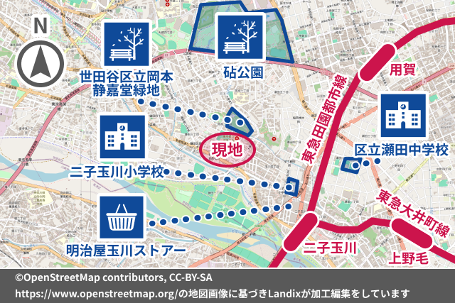 東急田園都市線 二子玉川駅 徒歩13分 東急大井町線 二子玉川駅 徒歩13分 東急田園都市線 用賀駅 徒歩23分 |