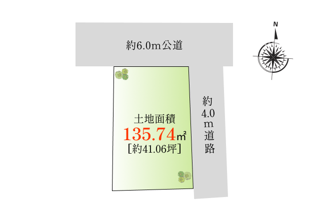 ●北側道路約6m×隣地通路約4mに面した整形地、陽当たり・開放感良好