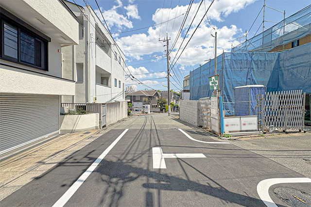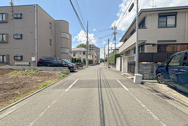 周辺は第一種低層住居専用地域に指定され、落ち着いた街並みが広がる住宅街。物件は北側約6.0mの公道に面し、東側は隣地通路となっているため、陽当たりや通風に優れた開放感ある住環境が魅力です。